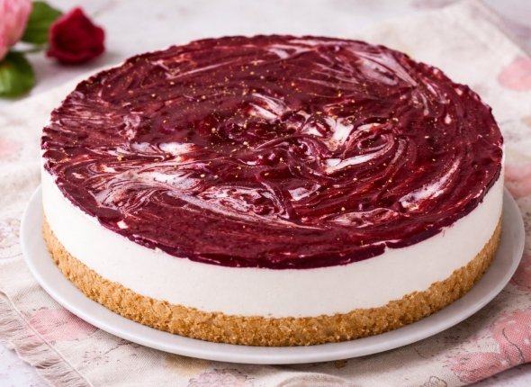 Вылейте мусс из белков и желатина на основу из печенья. Разровняйте массу, чтобы она покрыла всю поверхность, и отправьте торт в холодильник на 30-40 минут, чтобы мусс застыл и стал плотным.