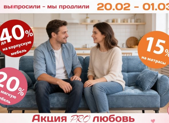 Акция PROлюбовь начнется 20 февраля и будет действовать до 1 марта включительно. Это прекрасная возможность приобрести мебель, которая наполнит ваш дом теплом и комфортом, а также сделать особенные подарки для любимых мужчин и изысканные знаки внимания для прекрасных дам.