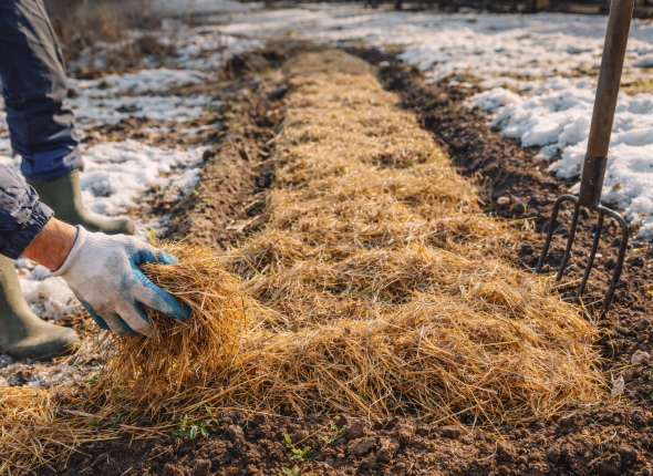 После подготовки почвы солому или сено раскладывают по поверхности грядок.