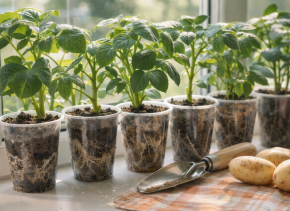 Семенные клубни не отправляют сразу в холодную весеннюю землю, а сначала дают им старт в домашних условиях. Картофель высаживают в пластиковые стаканчики объёмом 0,5–1 литр, ставят на светлый подоконник и выращивают как обычную рассаду.