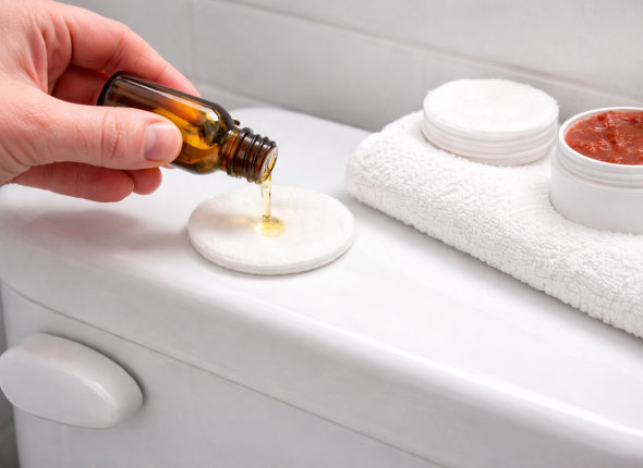Есть несколько удобных способов применения. Самый простой вариант — капнуть 1–2 капли эфирного масла под ободок унитаза. Там жидкость незаметна и постепенно испаряется, распространяя аромат.