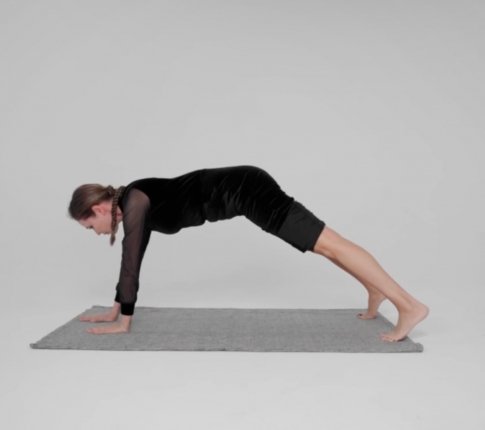 - Встаньте в классическую планку на прямых руках. Корпус держите ровно, живот подтяните, ладони должны находиться под плечами, стопы вместе.