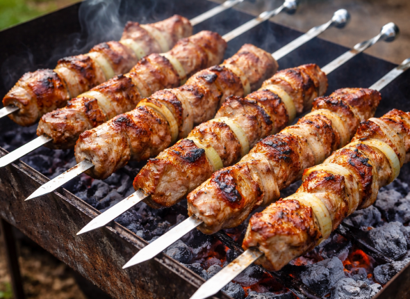 После маринования мясо нанизывают на шампуры и готовят на углях до румяной корочки. В процессе важно не пересушить шашлык — тогда он получится сочным и ароматным, с характерным "тем самым" вкусом.